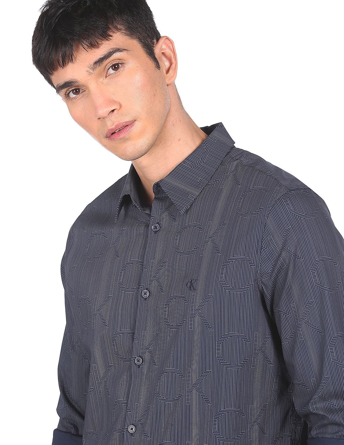 Men Navy French Placket Printed Smart Casual Shirt